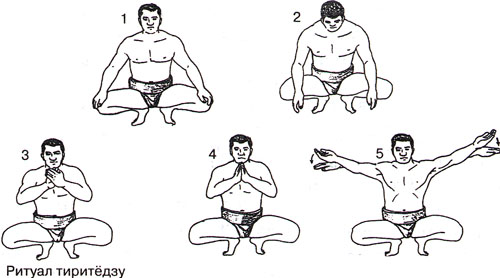 Тиритедзу выполняется обоими борцами одновременно при выходе на дохё. Они опускаются на корточки в позу соноке, балансируя на носках. Пятки оторваны от пола, туловище и голова держатся прямо, руки опускаются на колени. Борцы опускают руки вниз и кивают друг другу. Затем спортсмены сводят вытянутые руки на уровне груди, разводят их в стороны ладонями вниз и вновь сводят спереди с хлопком ладонями, выпрямляют руки и разводят их в стороны параллельно земле ладонями вверх, а в завершение ритуала поворачивают ладонями вниз.