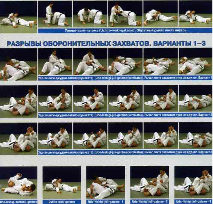 Удэ-хишиги-джуджи-гатамэ — Рычаг локтя захватом руки между ног (разрывы оборонительных захватов)